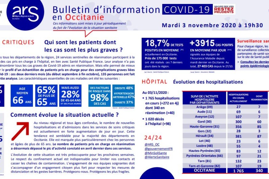 L'Agence Régionale de Santé vient de publier les nouveaux chiffres concernant la situation sanitaire en Occitanie. Le rapport est inquiétant avec 272 hospitalisations de plus en 4 jours. 1765 personnes sont hospitalisées dont 340 en réanimation (+40), 98 nouveaux décès, ce qui porte à 1020 décès depuis le début de l’épidémie en mars. 3 morts de plus dans le Gers Le Gers enregistre depuis le dernier point, 5 hospitalisations supplémentaires, 3 personnes sont actuellement en réanimation et 3 décès supplémentaires. Le nombre de patients pris......