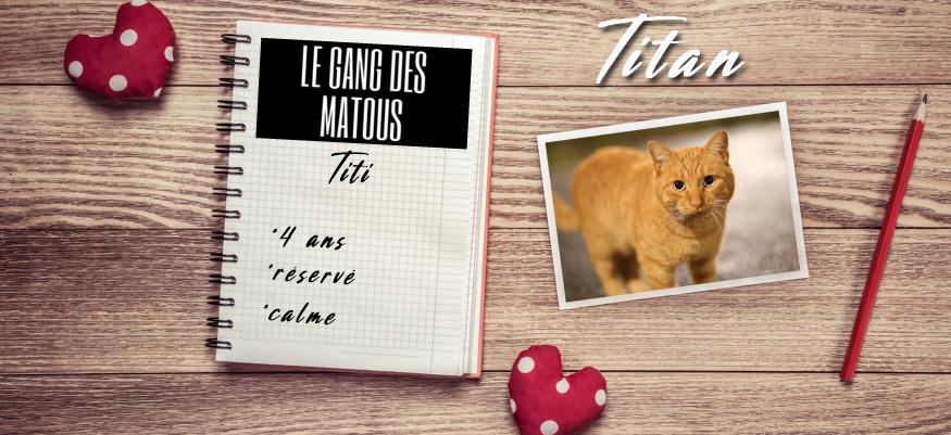 Titi, de son vrai nom Titan est estimé à 4 ans minimum. Après plus d'un an et demi de socialisation, peut-être à force de patience et de curiosité de sa part, il a commencé à se laisser approcher. Plutôt réservé et très calme, il a besoin de prendre le temps avant d'accorder sa confiance. Il ne se laisse pas facilement approcher mais n'est jamais bien loin afin de toujours nous observer.