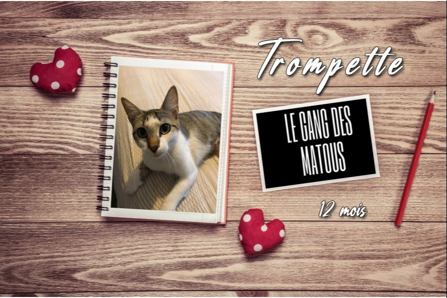 Trompette est une chatte d'un an environ, tabby grise et blanche. Lâchement abandonnée près des poubelles avec une belle inflammation des tétines et squelettique.  D'un naturel avenant et très sympathique, c'est un amour qui ne mérite pas ce qui lui est arrivé. Bavarde, elle adore raconter sa vie. Très attachante elle est en grande demande d' attention et de câlins.