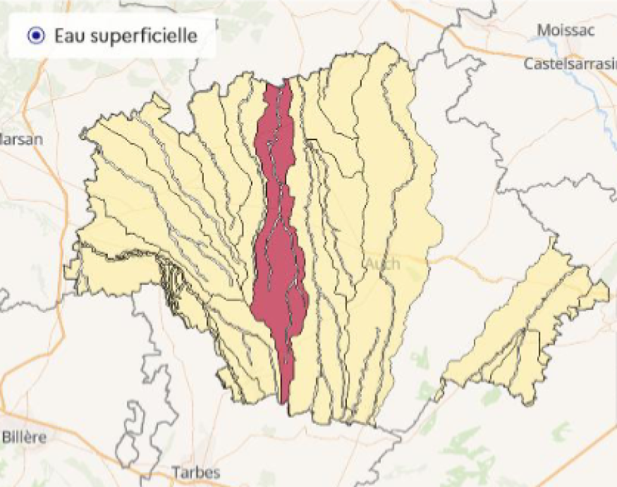 Le département du Gers se partage autour de deux grands bassins versants hydrographiques : l’Adour qui concerne 23 % du département, et la Neste et les rivières de Gascogne qui drainent la majorité des rivières gersoises et pour lequel le préfet coordonne les mesures applicables sur 6 départements.