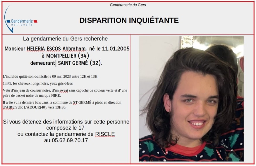 La gendarmerie du Gers lance ce mardi 9 mai un appel à témoins pour retrouver Ahbraham Heleria Escos, une disparition "jugée inquiétante". Ce jeune de 18 ans a quitté son domicile situé à Saint-Germé dans le Gers entre 12h et 13h. Il a été vu pour la dernière fois aux alentours de 13h30 dans le village à pieds se diriger en direction d'Aire sur Adour. Depuis ses proches n'ont plus aucune nouvelle.