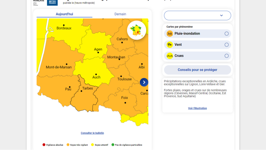 La journée de ce jeudi est marquée par un temps instable dans le sud ouest, dont une partie des départements bascule cet après-midi en vigilance orange pluie-inondation. C'est le cas des Hautes-Pyrénées, de la Haute-Garonne et du Tarn-et-Garonne. Les départements du Gers et du Lot-et-Garonne sont en vigilance jaune.